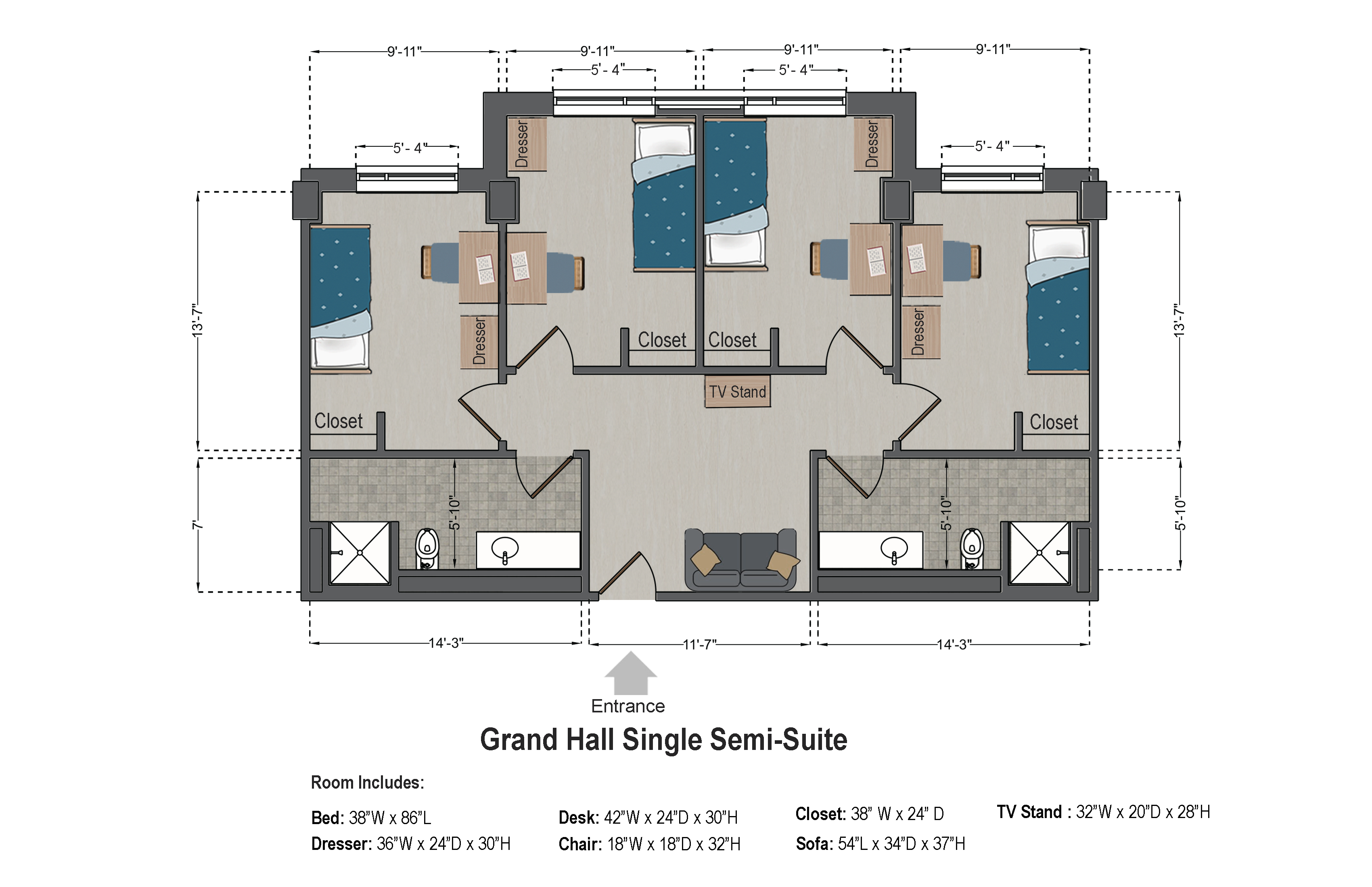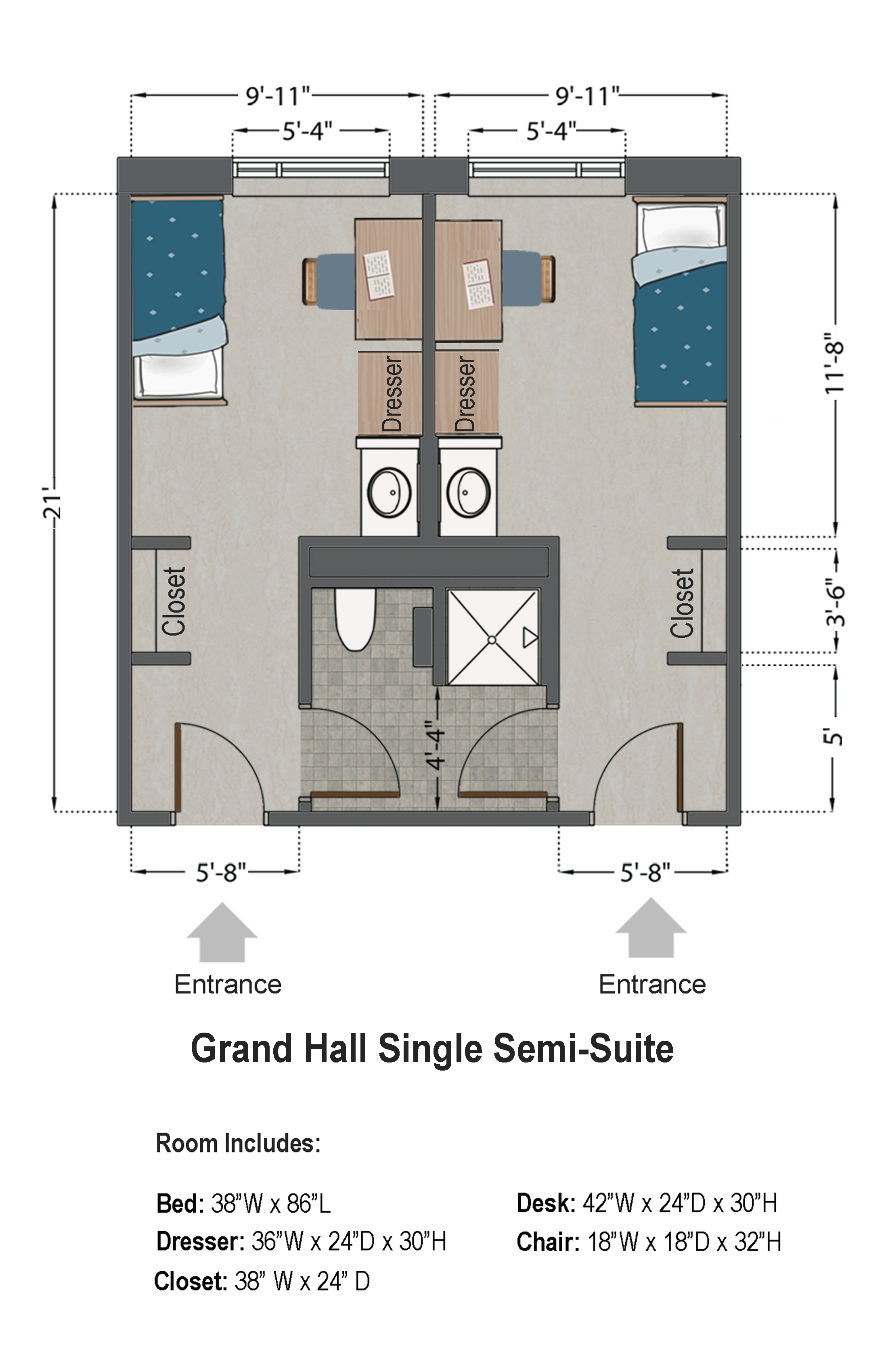 Bathrooms: | Semi-private. Residents of the suites share a bathroom. |
