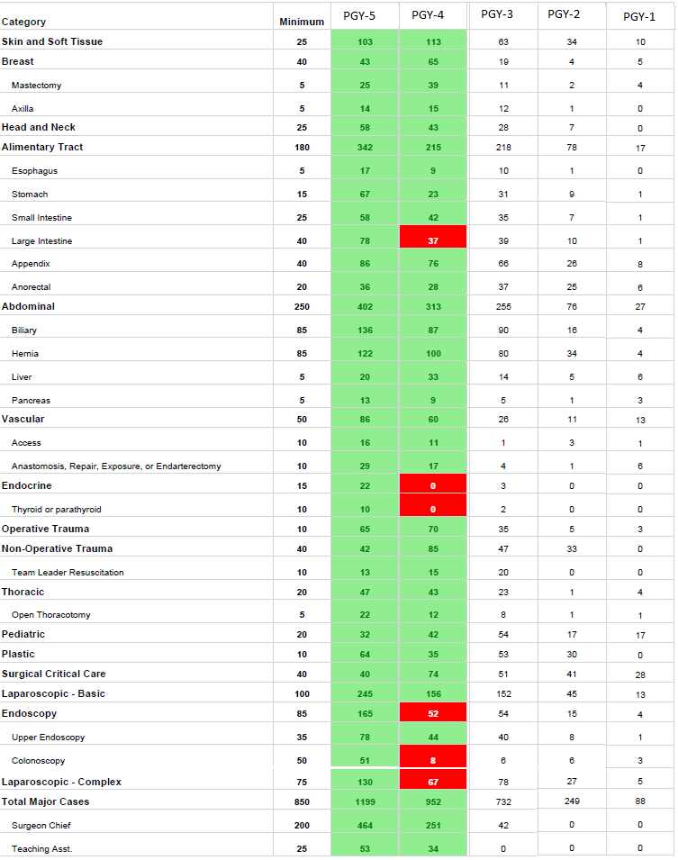 Our graduates have no problem meeting the required 250 major and minor cases by the end of PGY-2 year, or the 850 major cases required at the completion of their chief year. PGY-1 and PGY-2 residents are frequently the sole resident in year-appropriate cases. The opportunity for junior residents to double scrub into more complex cases allows for advanced learning and participation in aspects of the procedure. Within the surgical department, there are fellowships in vascular surgery and surgical critical care. The low number of surgical fellowships relative to other academic institutions allows for chief residents to have the full depth of operative experience.