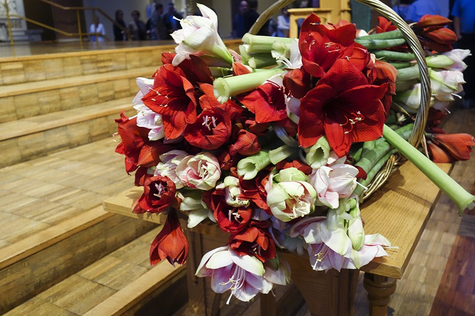 A first-year medical student places a flower in a basket during Friday's gift body memorial service. Photo by Maggie Rotermund